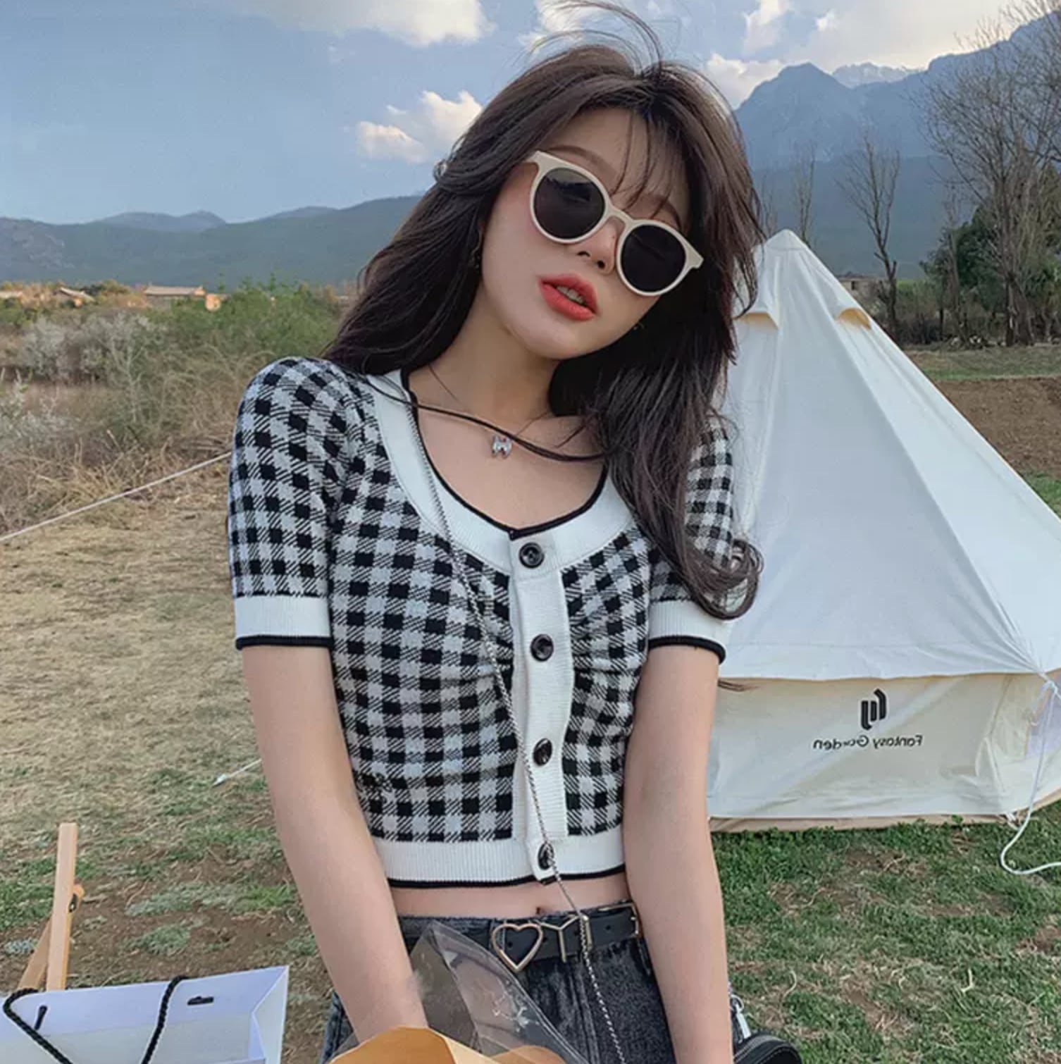 韓国デザイン♡ちらり 肌みせ♡ ギンガムチェック ニット 半袖 カーディガン