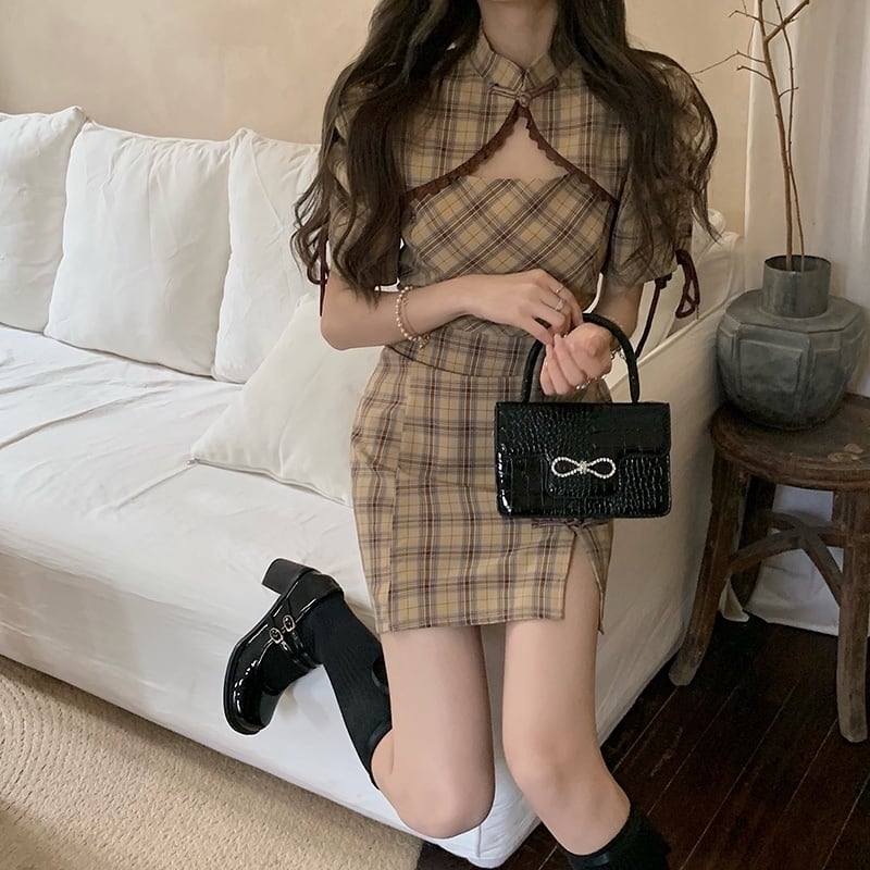 レトロっぽ♡胸元チラリ♪チェック柄 ミニワンピース ドレス スリム 大人可愛い