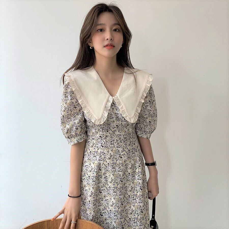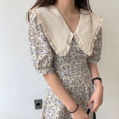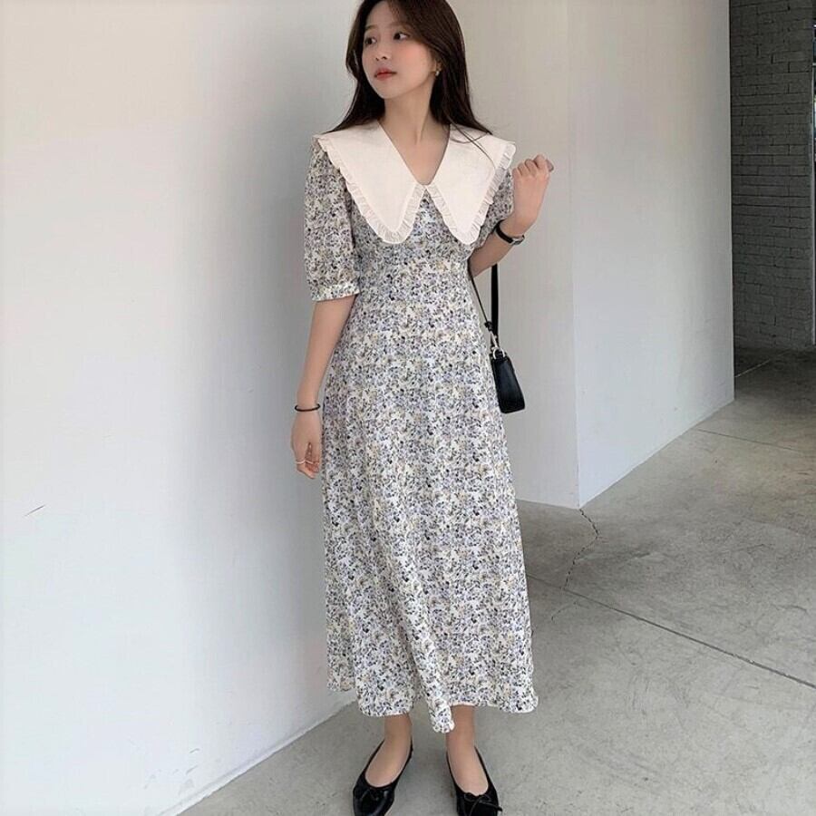 韓国デザイン♡大きめ襟がアクセント♪ パフスリーブ 小花柄 ロング丈 ワンピ
