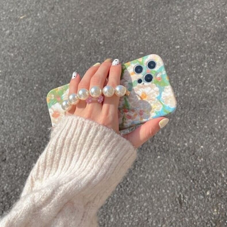 (送料無料)韓国♡ 大人可愛い♡ iPhoneケース 絵画風 パール 花柄 ハンドストラップ