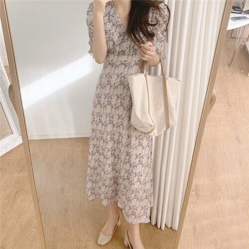 韓国デザイン♡ ラベンダー柄♡フレンチワンピース ロングワンピース