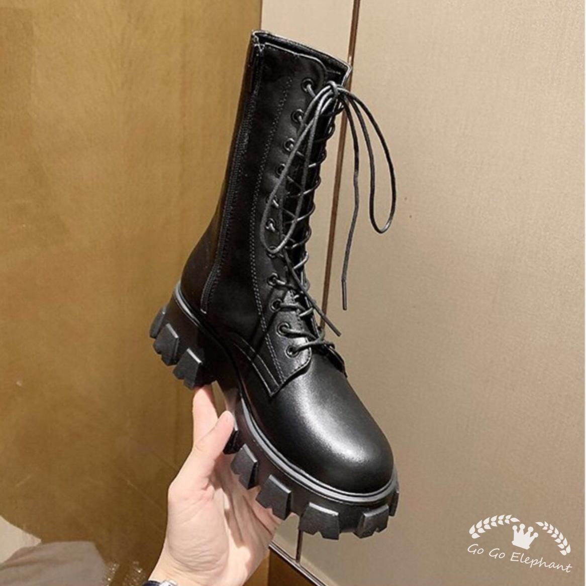 #レースアップ #クールに 厚底 レースアップ ブーツ 編み上げ PUレザー ミディアム 高見え 美脚 カジュアル モード系 #韓国