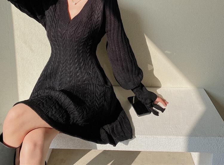 韓国デザイン♡パフスリーブ ニットフレア 編みデザイン 上品♡ ひざ丈ワンピース