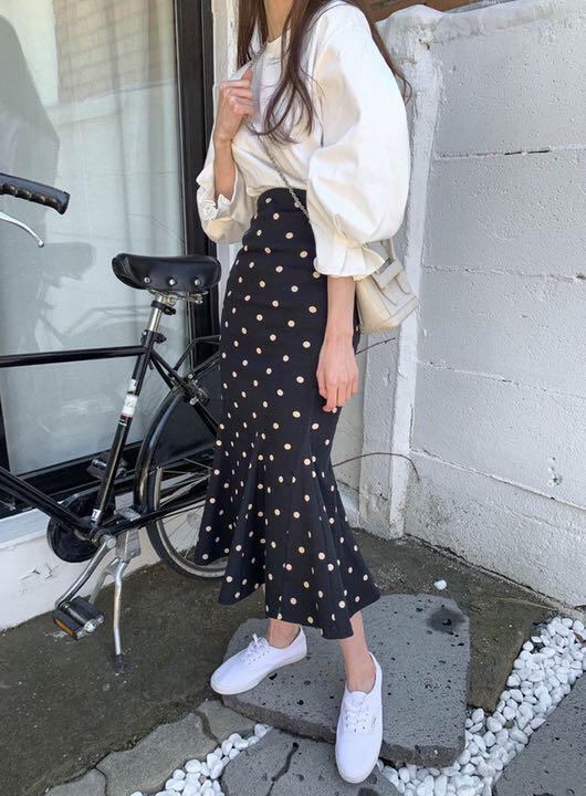 ドット柄のスカートは最近流行りのロング丈で、脚を細く長く見せてくれます♡
