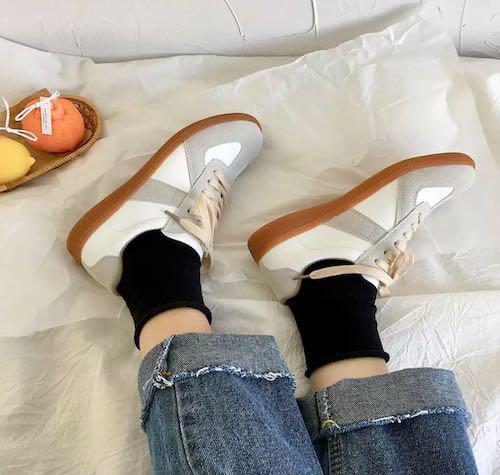 丸みのあるラウンドトゥに柔らかい色合いのスニーカー