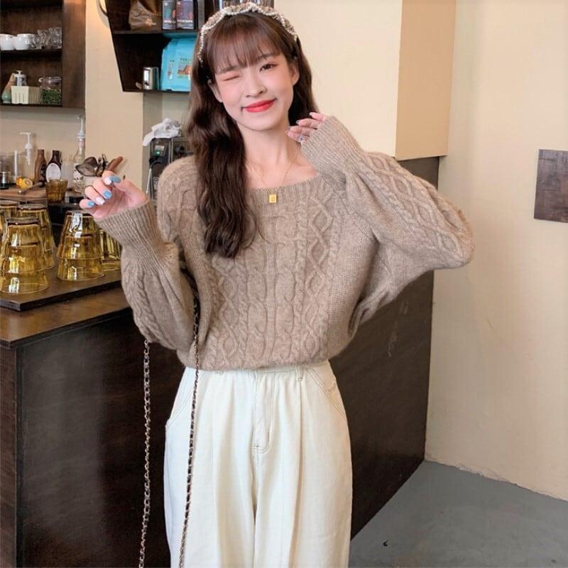 韓国♡デコルテを 綺麗に魅せる♪ ケーブルニット スクエアネック バルーン袖