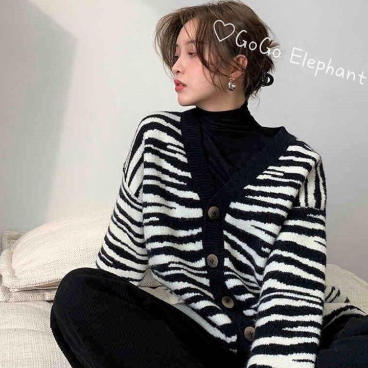 ☆★ 新品入荷 韓国デザイン♡ゼブラ柄 今時女子♪ ニット カーディガン Vネック ゆったり ★☆