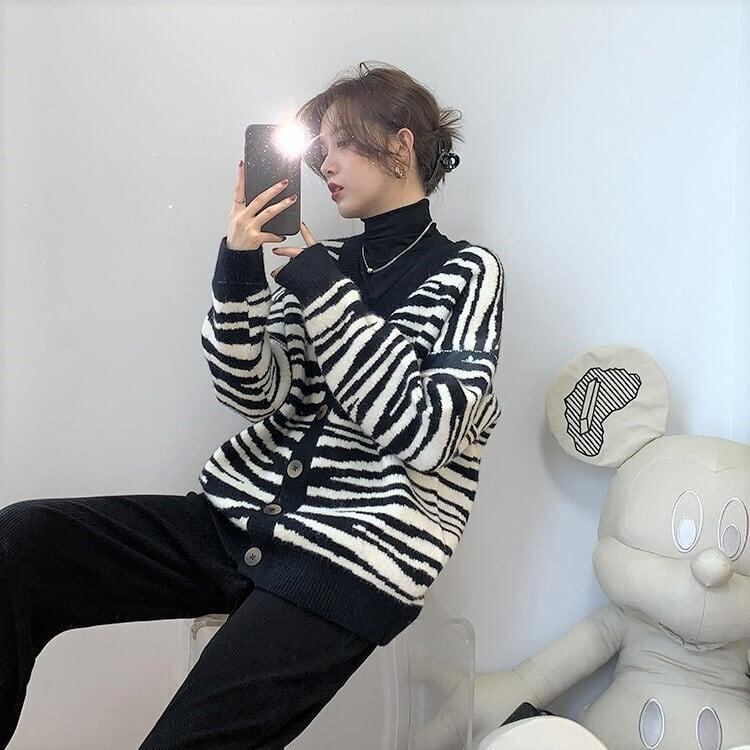 韓国デザイン♡ゼブラ柄 今時女子♪ ニット カーディガン Vネック ゆったり
