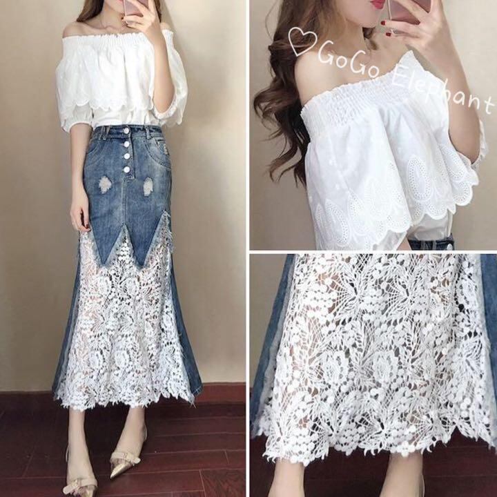 ☆★ 新品入荷 女子力アップ♪ セットアップ レースブラウス デニムスカート★☆