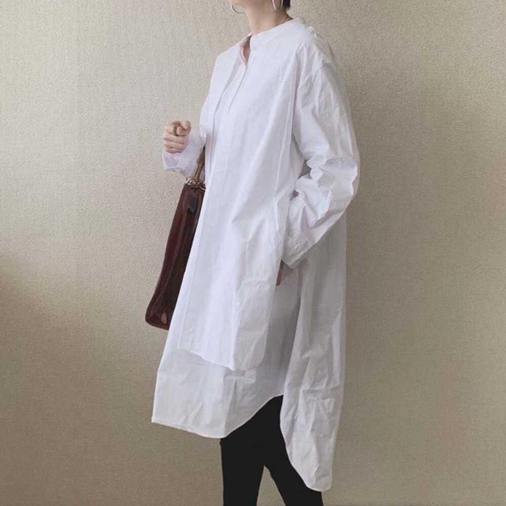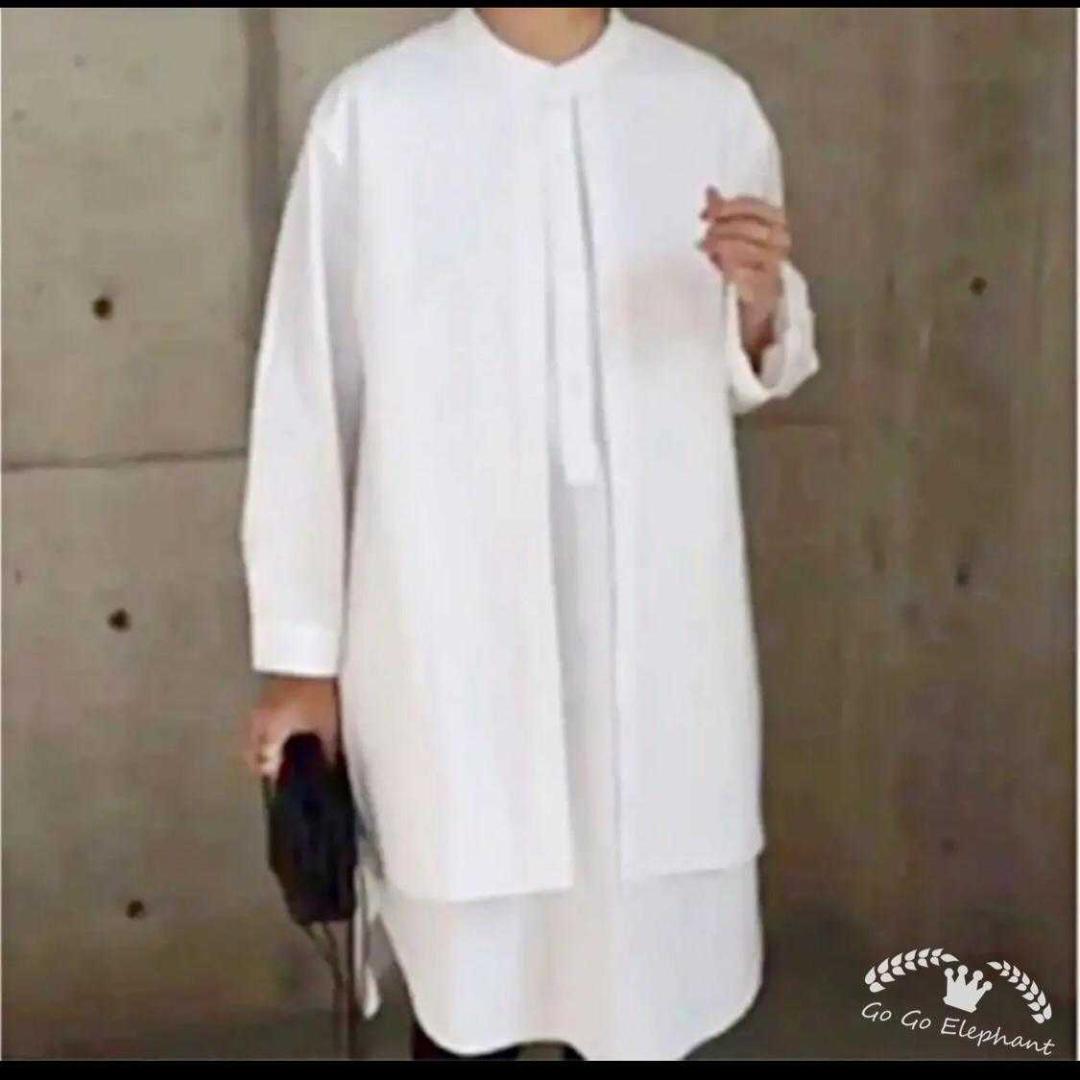 大人気 デザインシャツ ロングシャツ ホワイト スタンドネック