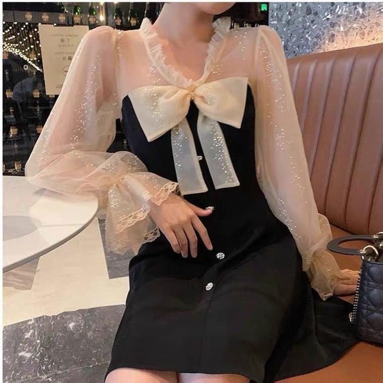 ☆★ 新品入荷 韓国♡ フレンチドール ガーリー♡シアー リボン 切り替えワンピース ドレス ★☆