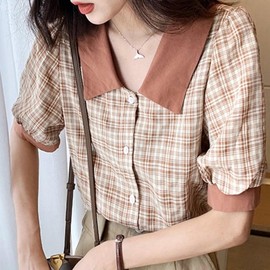 チェック柄の切り替えデザインがどこかレトロな雰囲気の可愛らしいブラウス♪