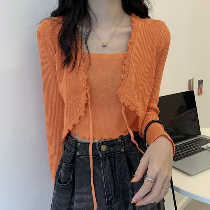 キャミ&カーディガン風のフェイクツーピーストップス!