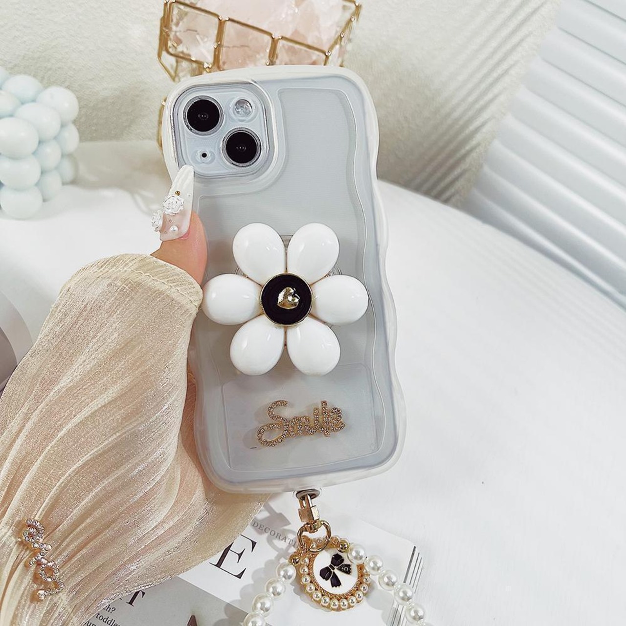 韓国♡ ゆめかわ♡ パールストラップ フラワーソケット付き iphoneケース