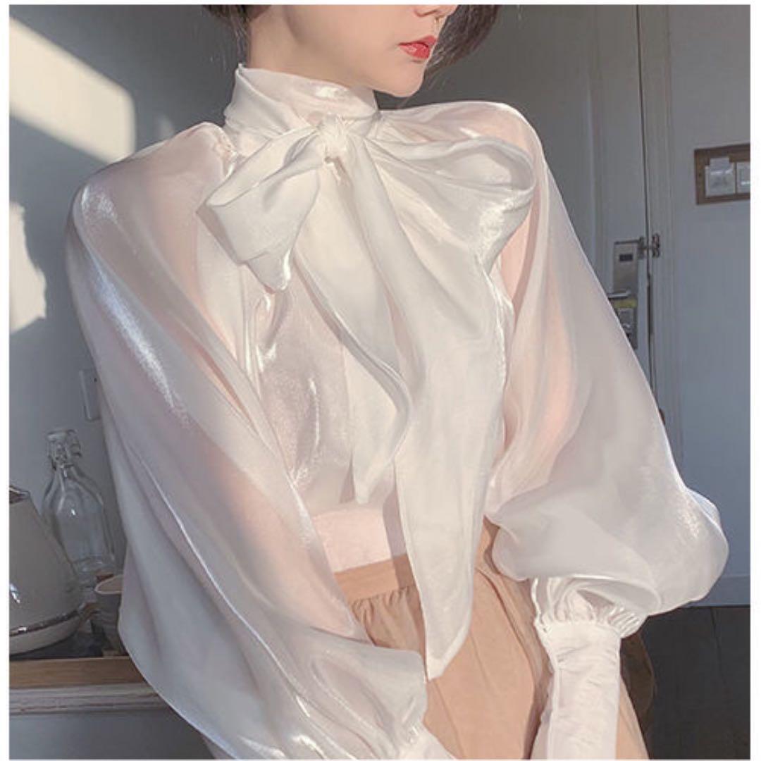 ☆★ 新品入荷 韓国デザイン♡光沢感❤️ bigリボン とろみ シャツ ブラウス パフスリーブ