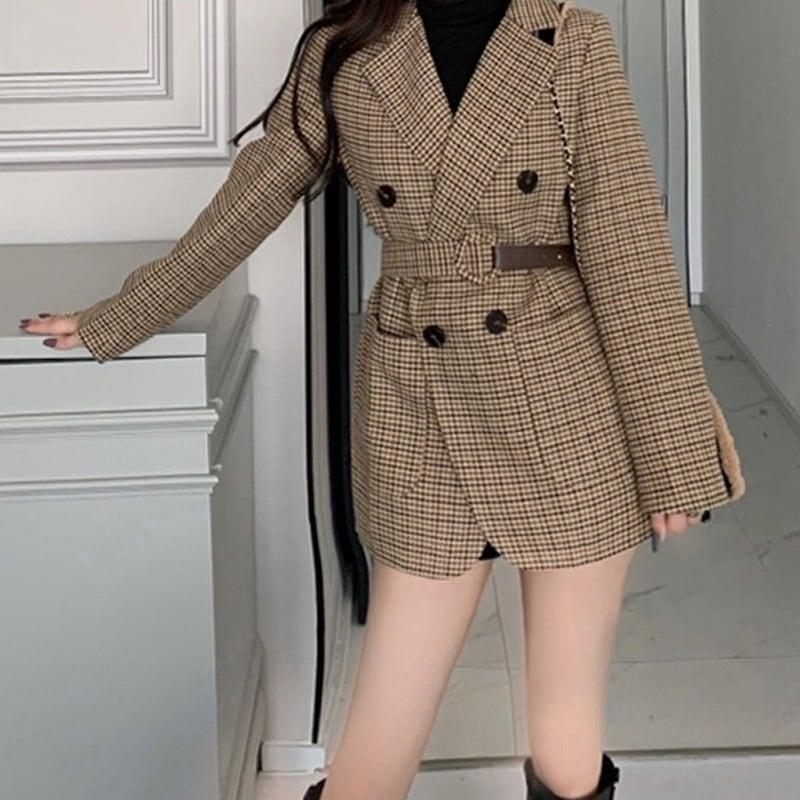 ☆★ 新品入荷 韓国♡レトロ♡チェック柄 英国風 ♪ジャケット コート チェック柄 ベルト付き ハイウェスト★☆