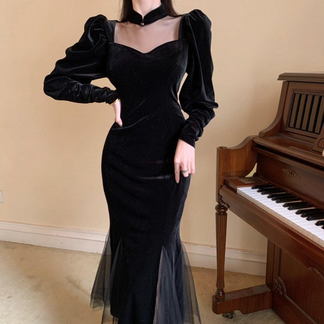 韓国デザイン♡お呼ばれで活躍♪ ベロア マーメイド ドレス ワンピース チュール