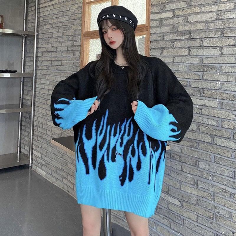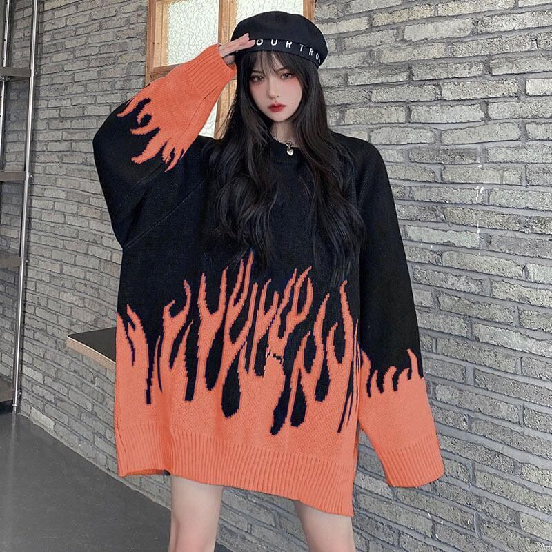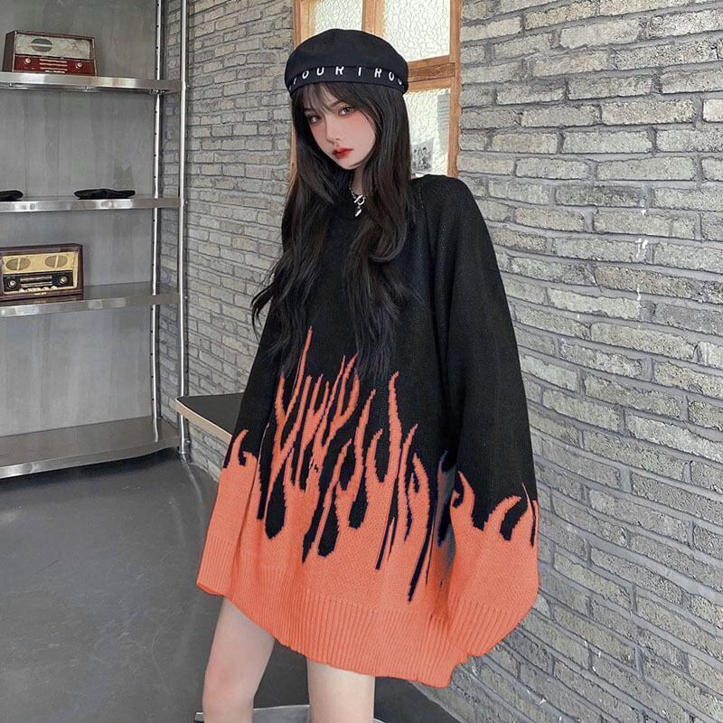 ☆★ 新品入荷 韓国♡ファイヤーモチーフ で圧倒的 存在感 ♪ トップス オーバーサイズ ニット ★☆