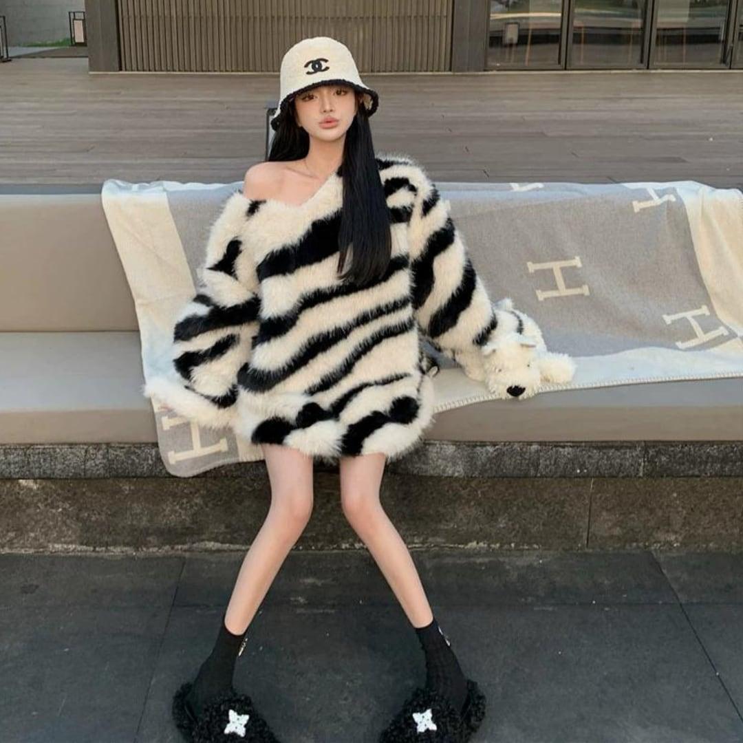 ☆★ 新品入荷 韓国♡ビッグシルエットで華奢見せ♪ ゼブラ シャギーニット トップス セーター ★☆