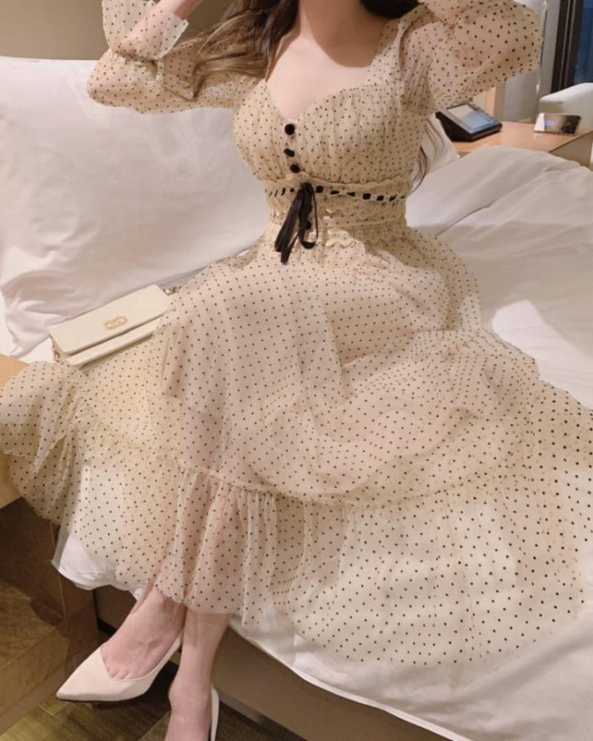 韓国デザイン♡韓国お嬢様 ドット柄 ワンピース ドレス お上品 胸元綺麗い