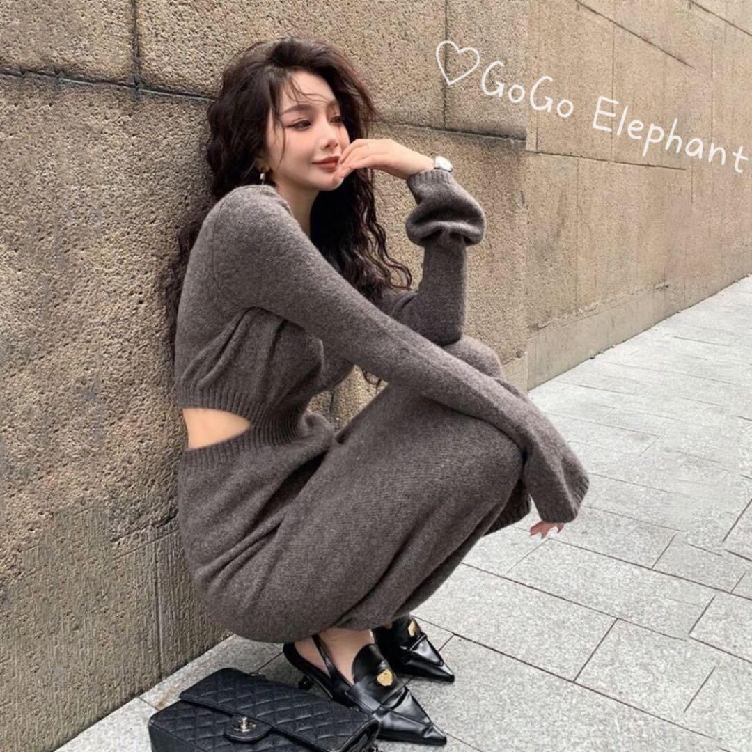 韓国エレガント 大人女子♡ ちょいセクシー ロングニットワンピース ウエスト見せ