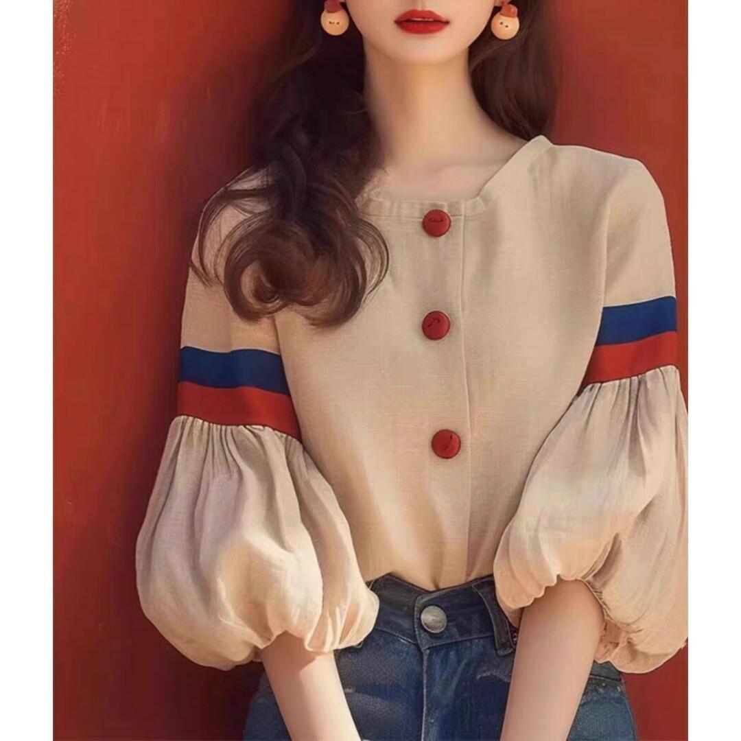 韓国♡配色がきれい♪ レトロ ランタンスリーブ シャツ ブラウス トップス 着痩