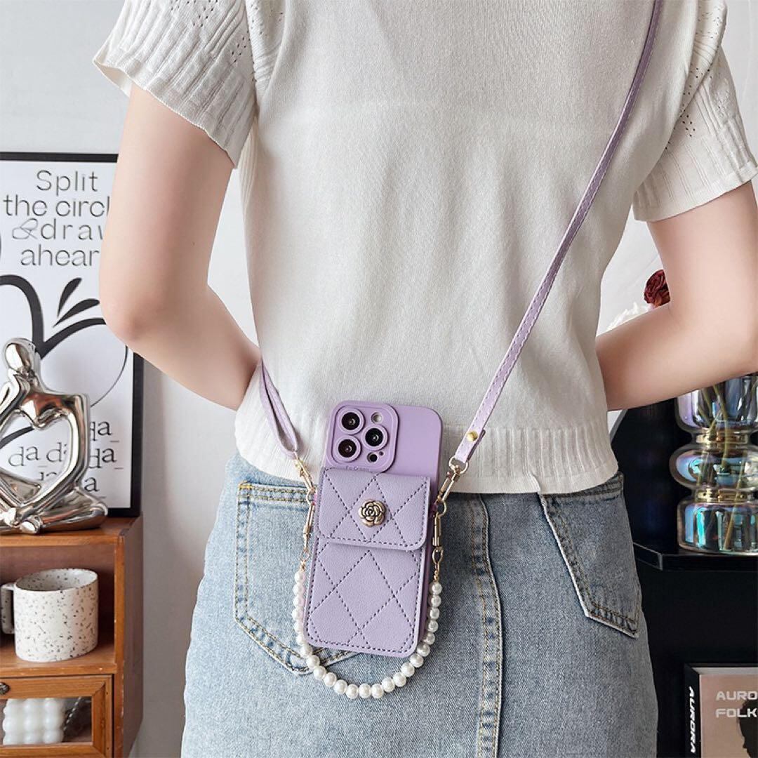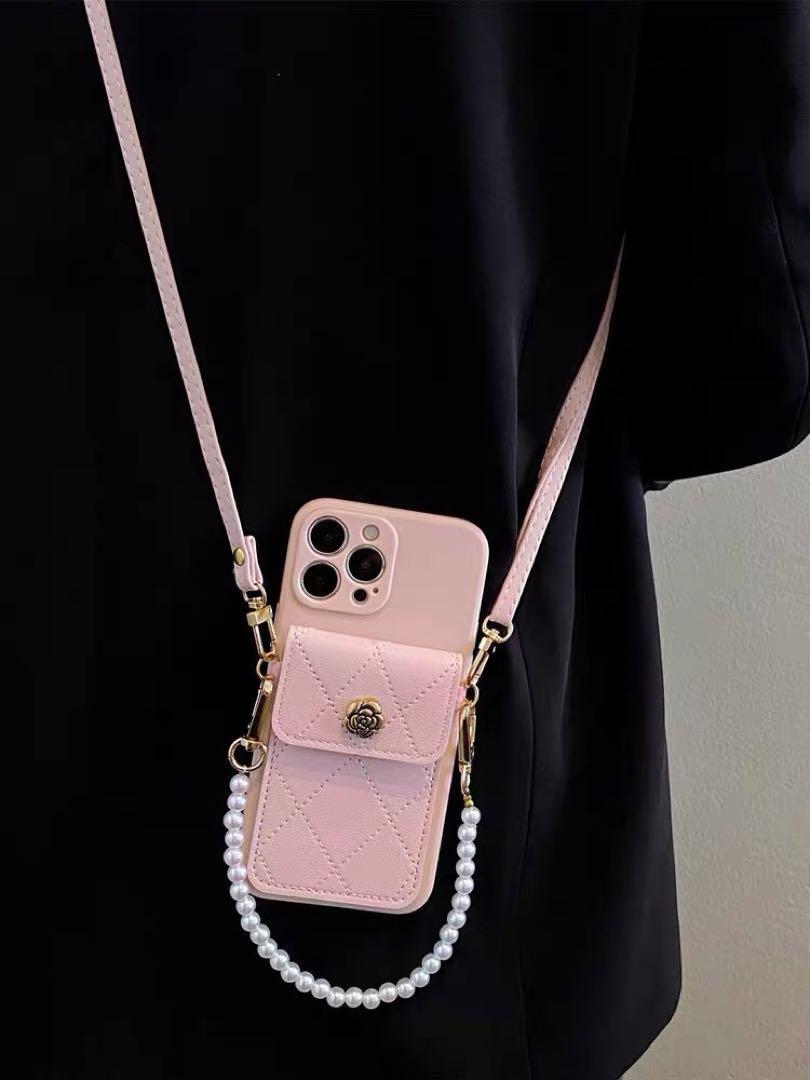 韓国♡カード収納付き パールストラップ フラワー ショルダー iphoneケース