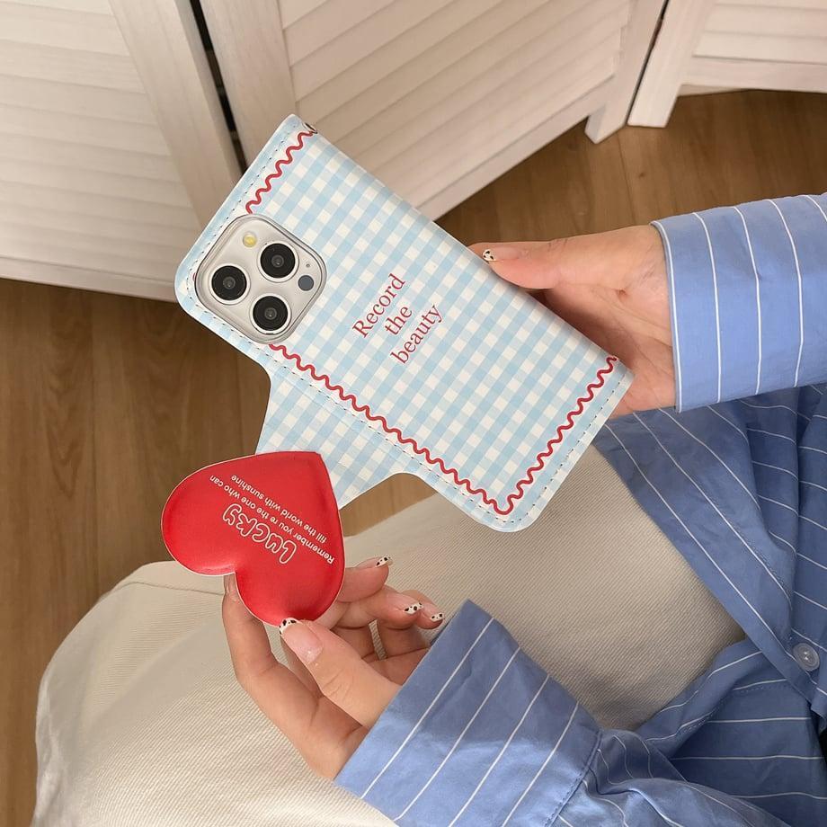 韓国♡ハートが可愛い チェック柄 高級感 手帳型 カード入れ iphoneケース