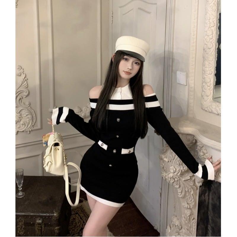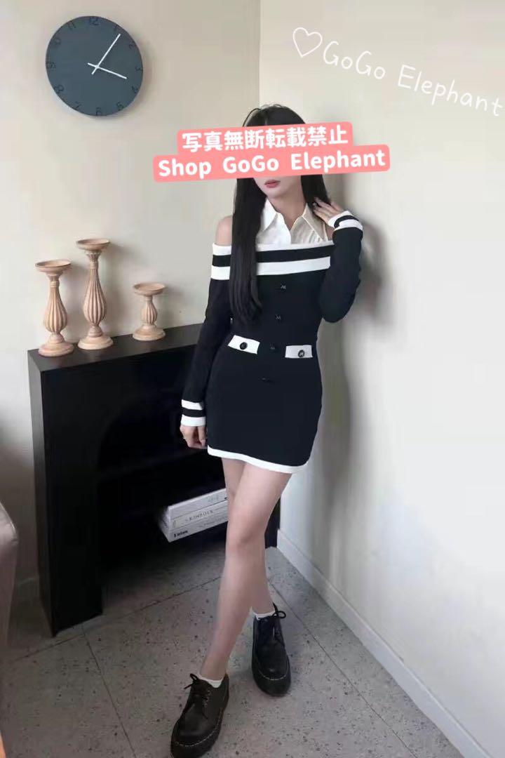 ☆★ 新品入荷 韓国♡一目惚れ上品さ♪ バイカラー オフショルダー ドッキング ニット ワンピース ♡