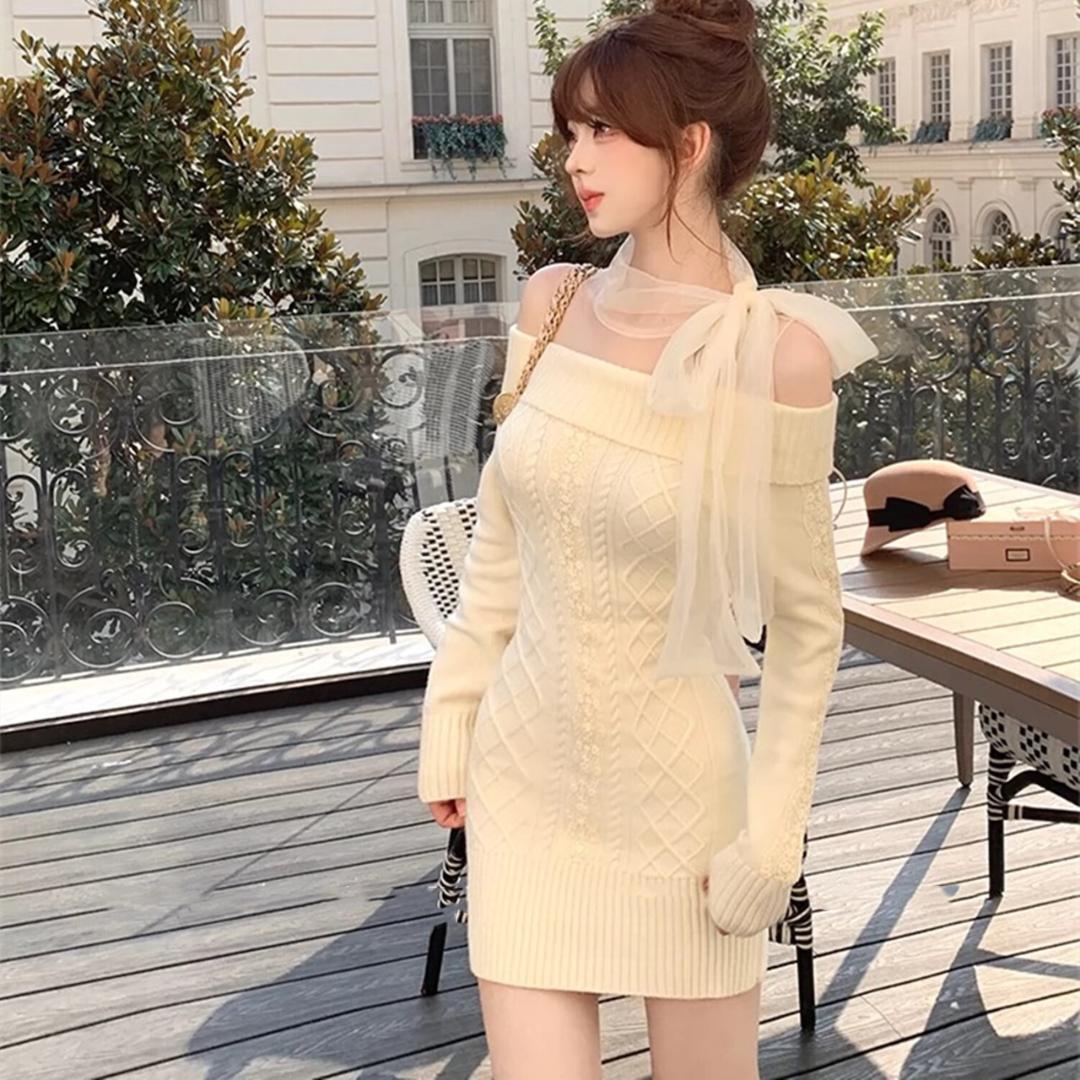 ☆★ 新品入荷 韓国♡愛される 綺麗め♡ チュール ドッキング リボン ニット ワンピース 上品 ★☆