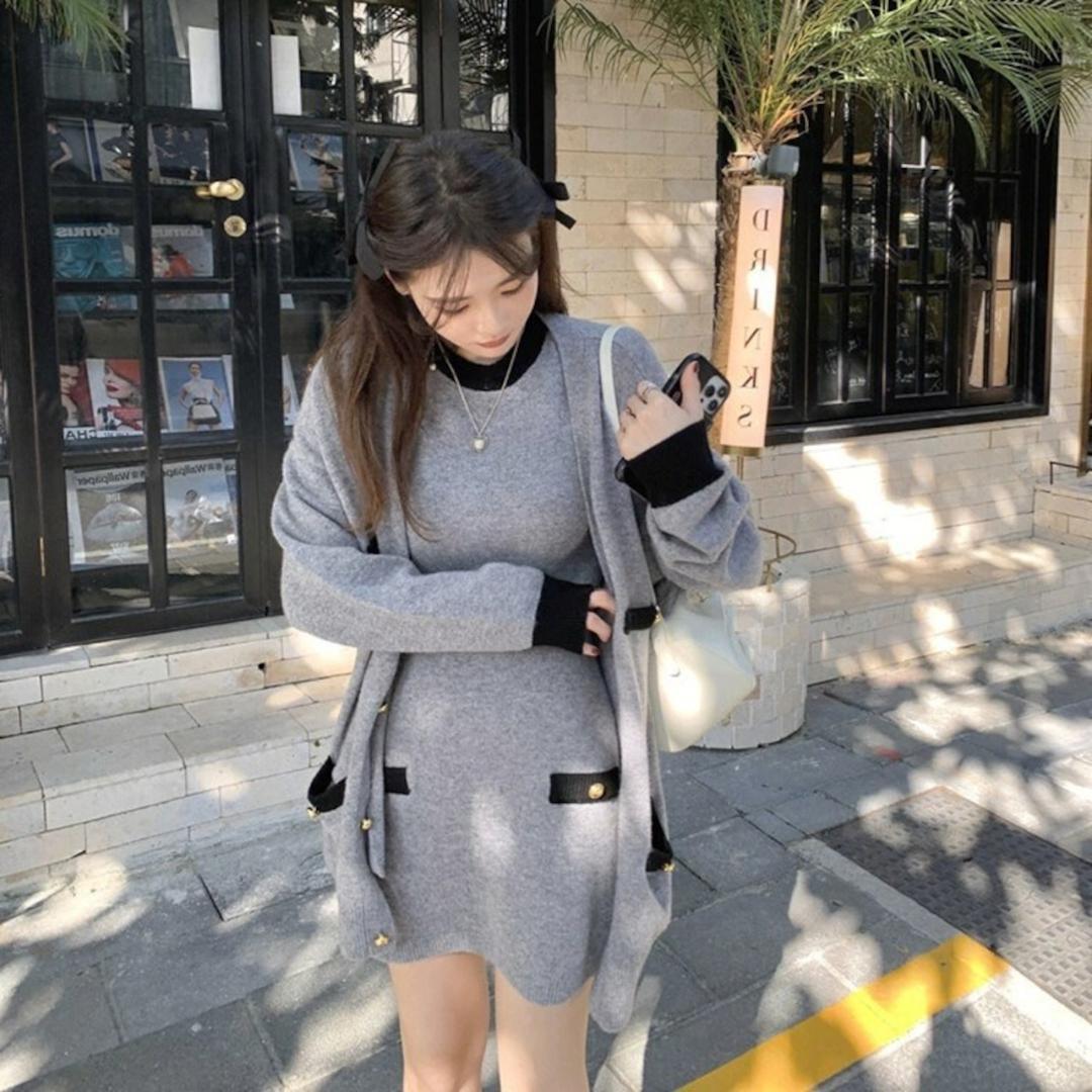 ・韓国デザインのタイトワンピースとカーディガンのセットアップ♪