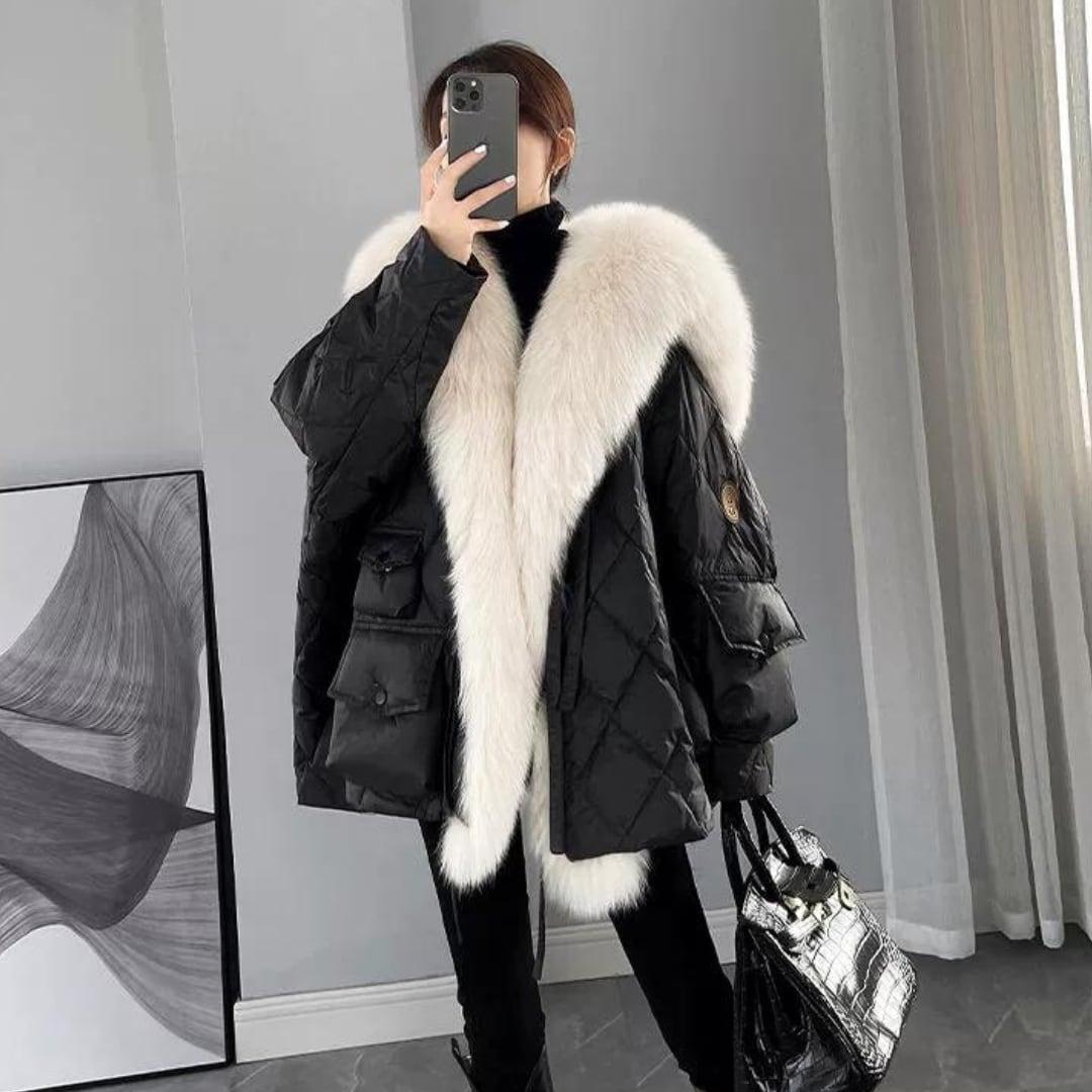毛足の長いふわふわとした滑らかなフェイクファーがラグジュアリーな雰囲気のダウンライクジャケット。