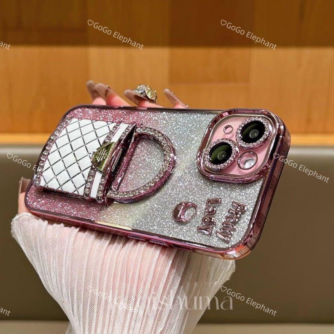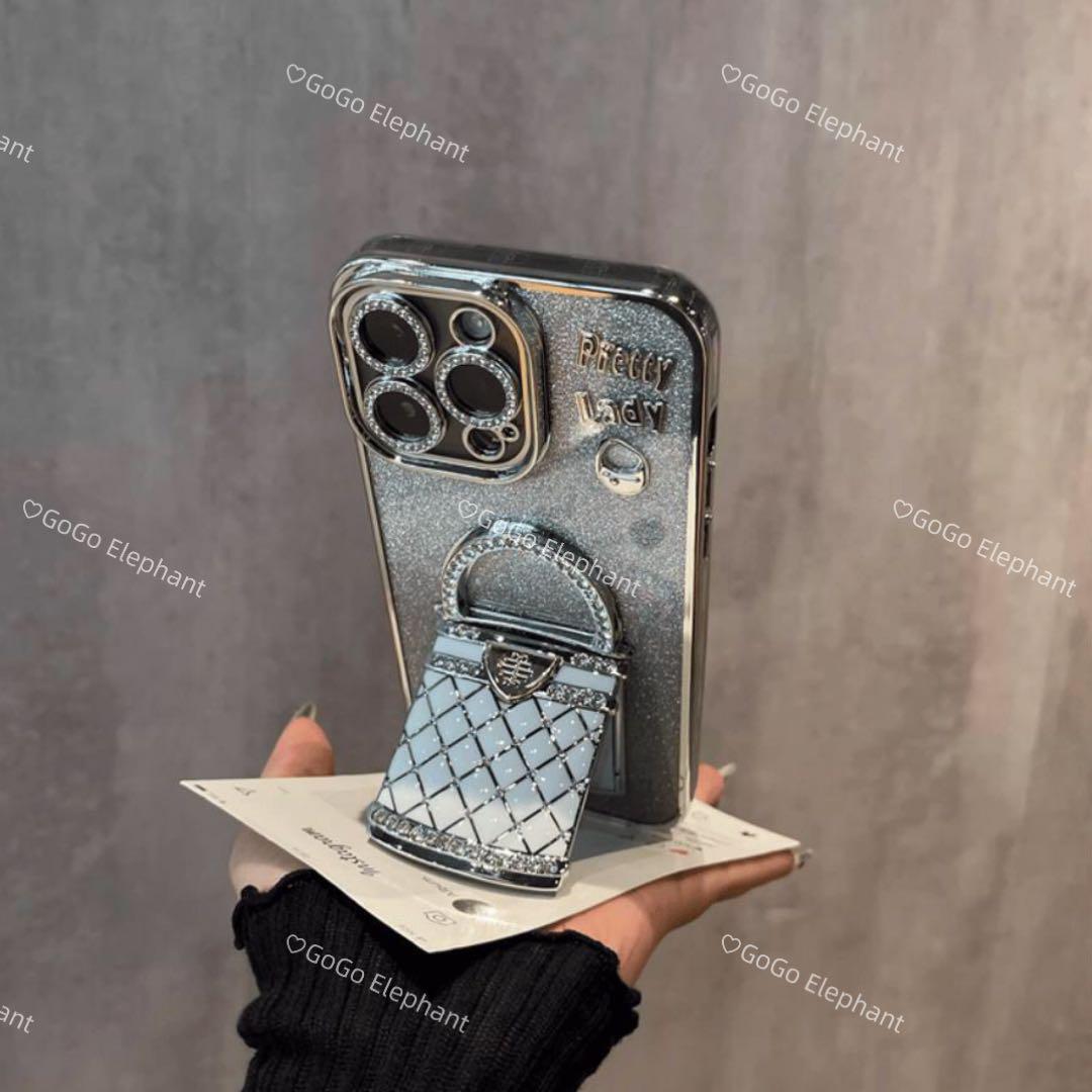 ♡おしゃれなバック型の鏡として使用できるスマホスタンド付き、キラキラオシャレで多機能♪