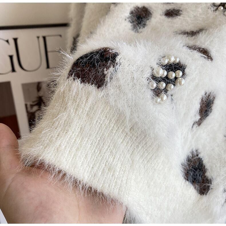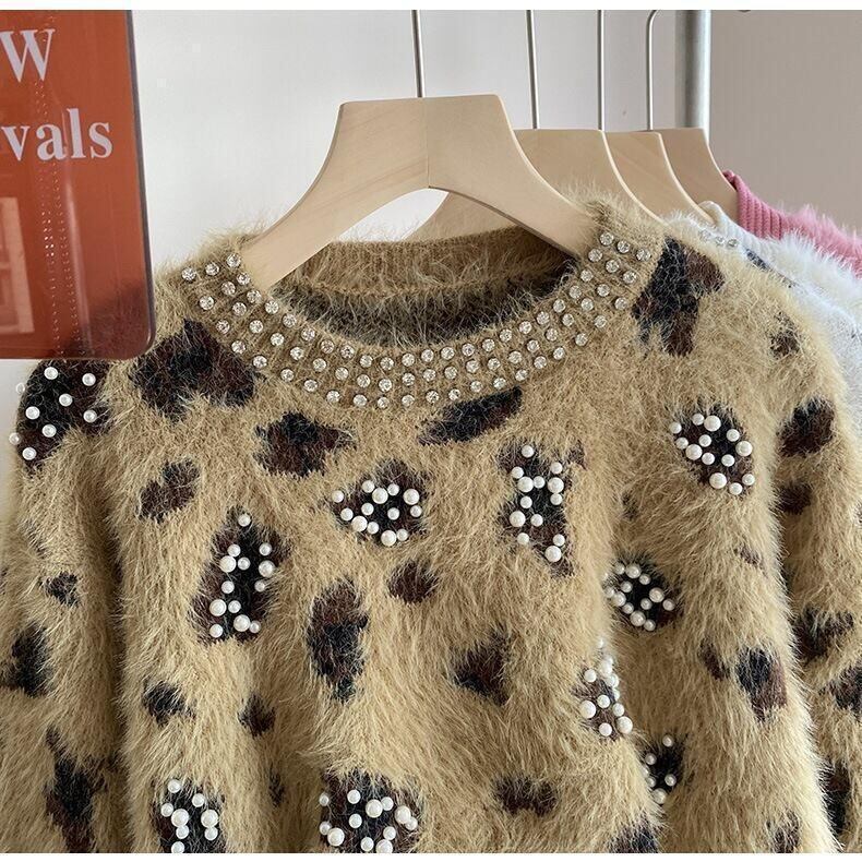 ☆★ 新品入荷 韓国♡高級感♪ ヒョウ柄 パール ふわふわ ファー ニット セーター おしゃれ 可愛い トップス レディース 秋 冬 長袖 新品