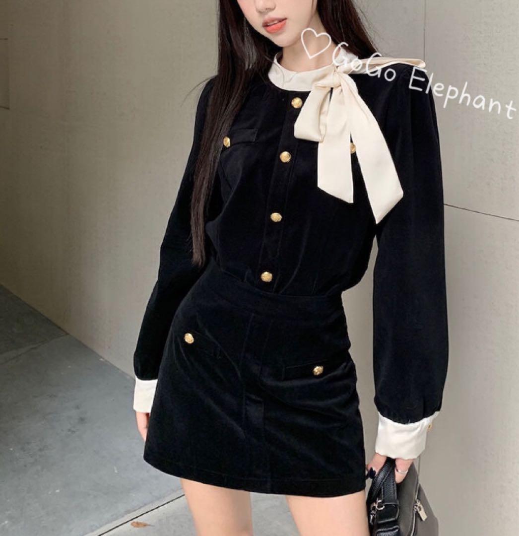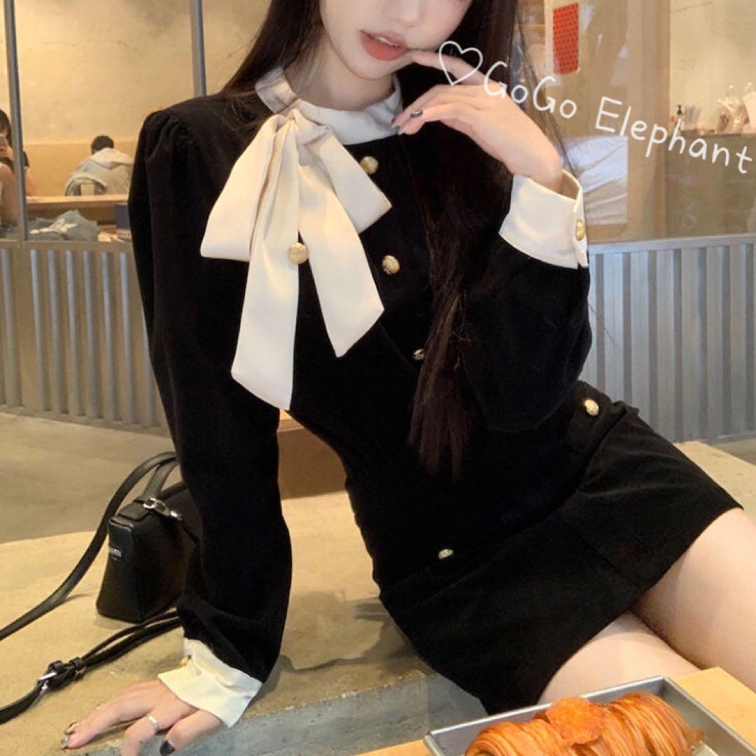 ☆★ 新品入荷 韓国♡お嬢様 フレンチドール 高級感 リボン ブラウス ミニスカート セットアップ ボタンミニワンピース 2点セット レディース 秋冬長袖 大人可愛い おしゃれ ★☆