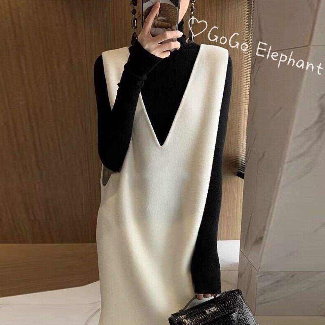 ☆★ 新品入荷 韓国♡上品 柔らかい 無地 Vネック ジャンスカ ベスト ロングワンピース ニット トップス セーター レディース 服 シンプル 秋冬 新品 着回し★☆