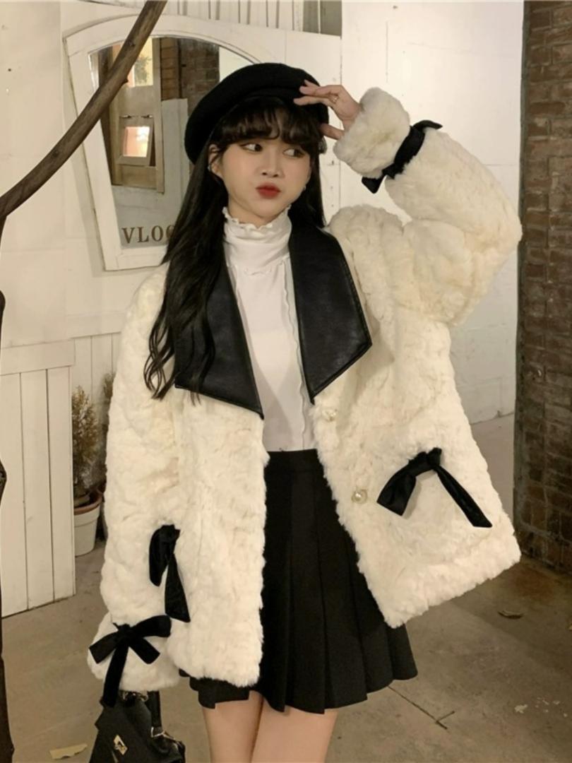 韓国♡可愛い ベロアリボン ふわふわ ボリューム エコファー コート アウター