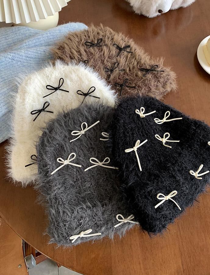 韓国♡可愛い ふわふわ ファー リボン ニット 帽子 y2k 流行 おしゃれ防寒
